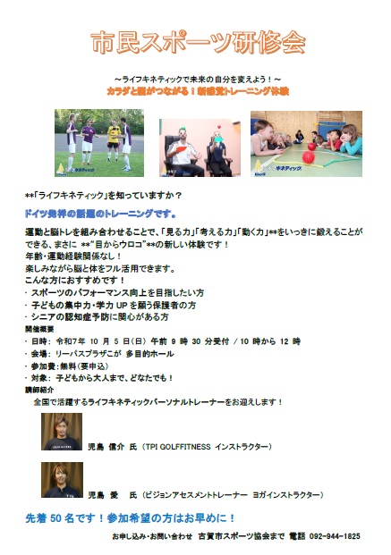 古賀市スポーツ協会から、特別な研修会のお知らせです。運動が苦手な方でも、スポーツをもっと楽しみたい方でも大丈夫!ドイツ発祥の最新トレーニング「ライフキネティック」を体験できる無料のイベントを開催します。