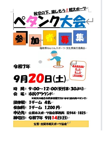 募集名 | 第19回古賀市民軽スポーツ(ペタンク)大会 第25回福岡県ねんりんスポーツ文化祭 |