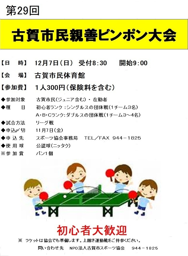 下記の通り、第29回古賀市親善ピンポン大会を開催します。
