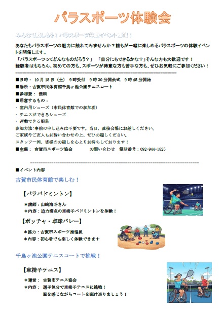 • 車椅子テニス: 選手気分で車椅子テニスに挑戦してみませんか?運営は古賀市テニス協会が行います。