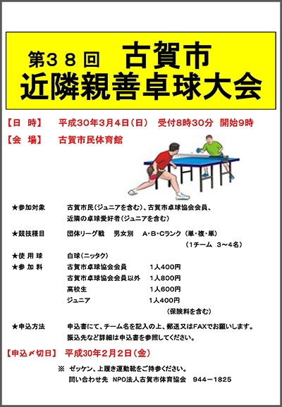 下記の通り、第38回古賀市近隣親善卓球大会を開催します。