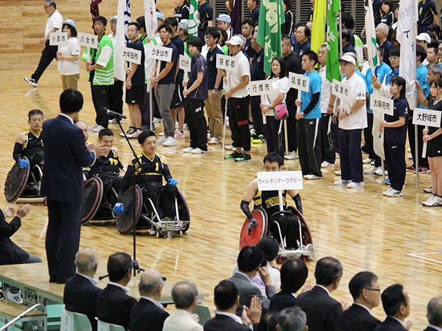 また、昨年より障がい者スポーツも同時開催となり、入場行進には九州唯一のウィルチェアラグビーチーム、Fukuoka Dandelionさんが参加されました。開会式終了後には体験会もあり、役員数名が参加されました。