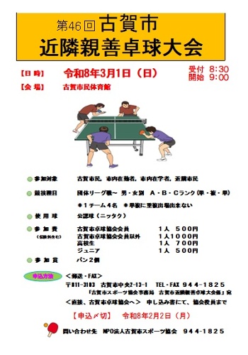 卓球協会 第39回古賀市レディース卓球大会下記の通り、第39回古賀市レディース卓球大会を開催します。 募集名 第39回古賀市レディース卓球大会 日時 令和8年1月25日(日) 9時~18時 場所 古賀市民体育館 対象 古賀市民女性 近隣都市女性 中...