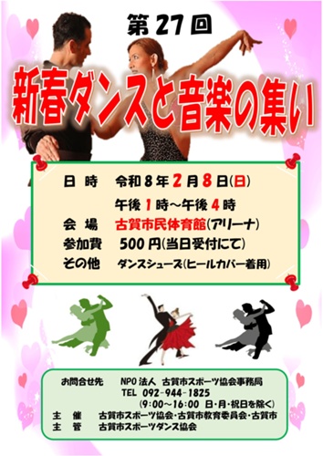 スポーツダンス協会 第27回新春ダンスと音楽の集い「第27回新春ダンスと音楽の集い」を令和8年2月8日(日)に古賀市民体育館にて、13時より開催します。皆様のお越しを会員一同お待ちしております。 募集名 第27回新春ダンスと音楽の集い 日時 2月8日(日) 12時30分受付 13...